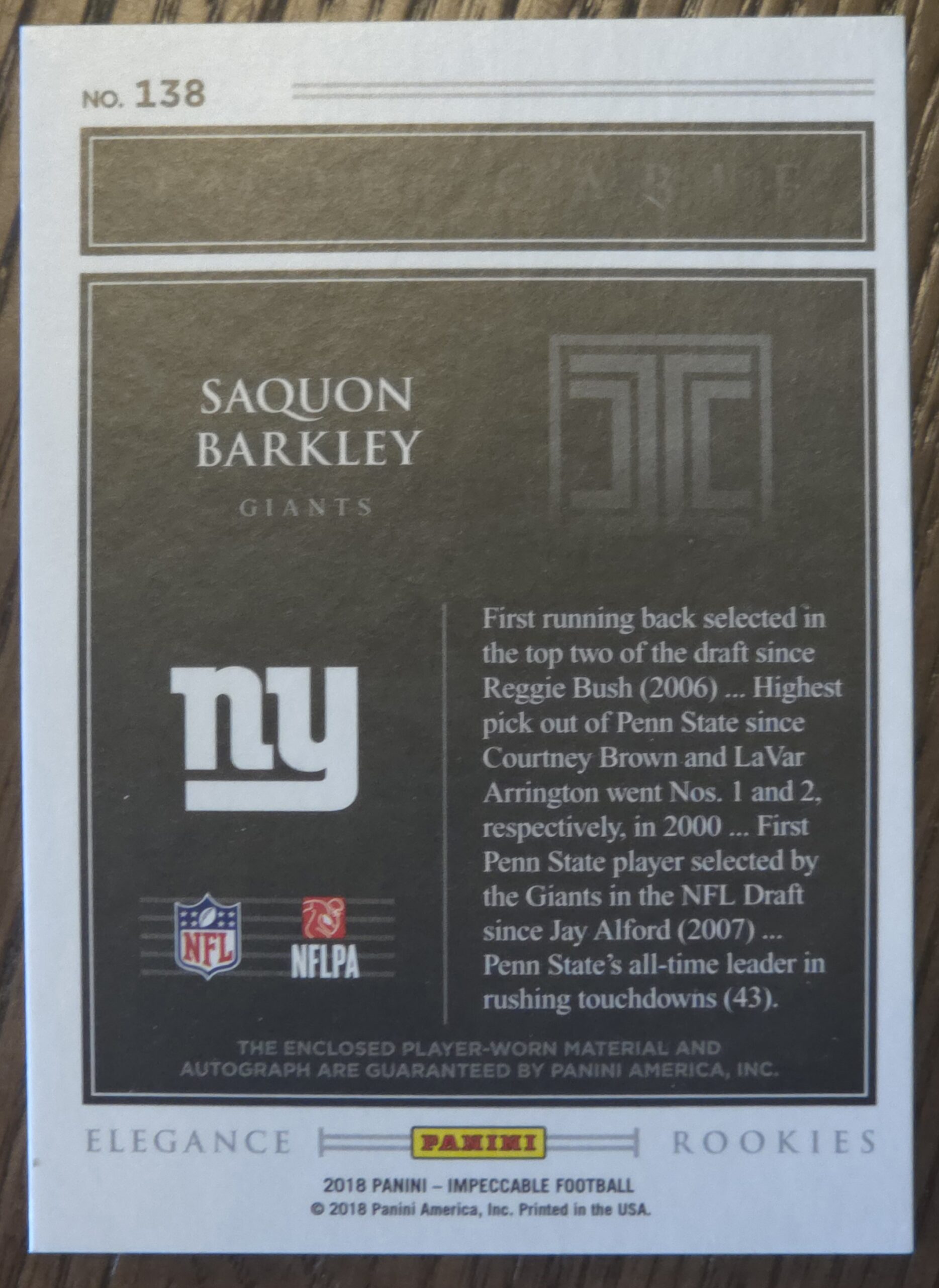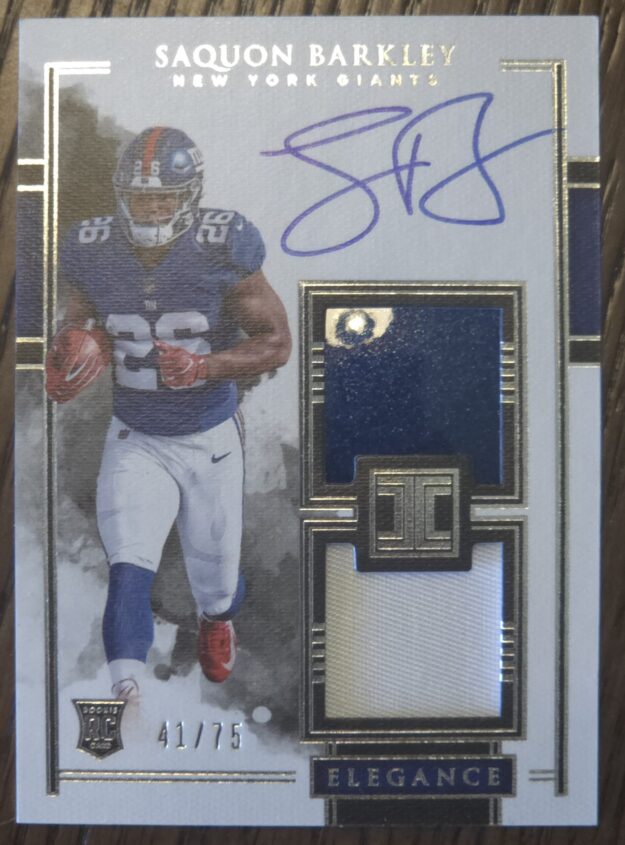2018 Panini Immpecable Saquon Barkley Auto Dual Relic RC this has a piece of his Giant helmet in the card.