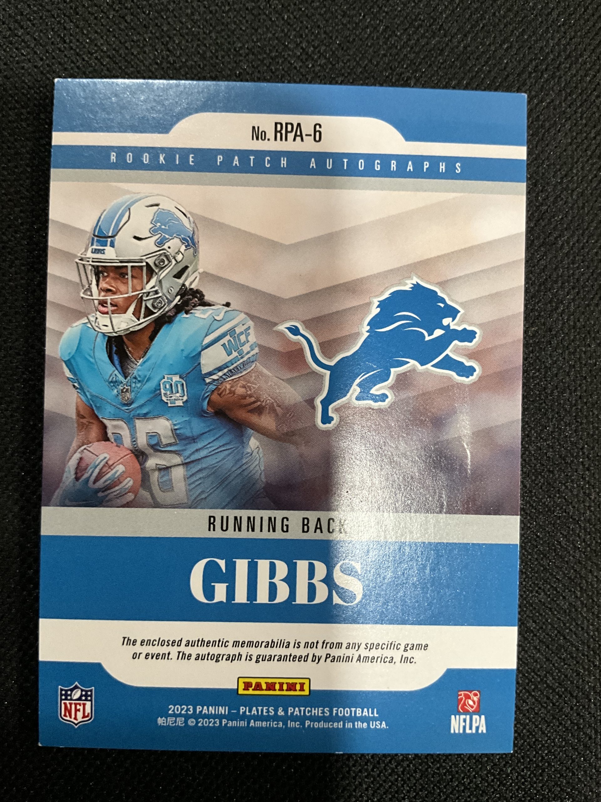 2023 Panini Plates and Patches Jahmyr Gibbs relic/ auto RC 63/75