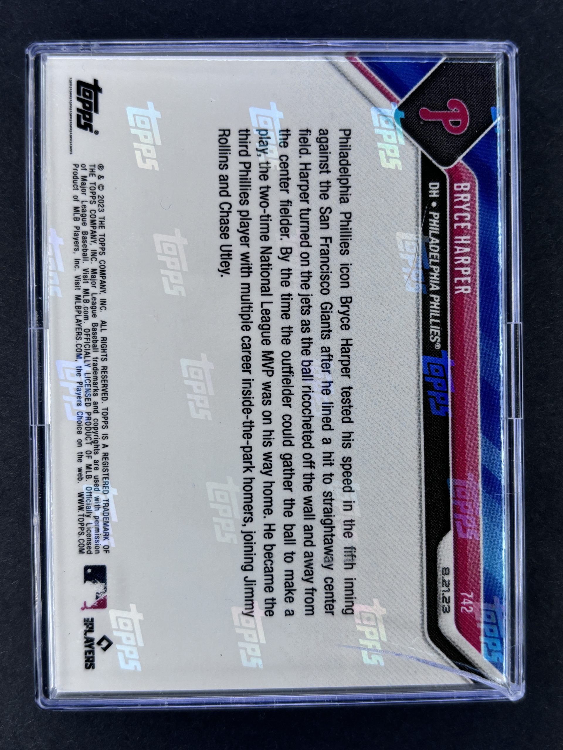 2023 Topps Now Bryce Harper 3rd Phillies player with Multiple Inside the park HRs. The NOW cards are ordered directly from Topps a day or two after an event happens in a game. they are not in packs and are limited print and limited sales.